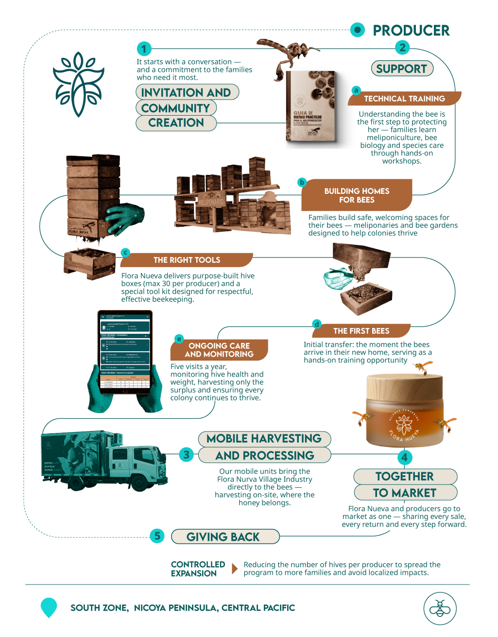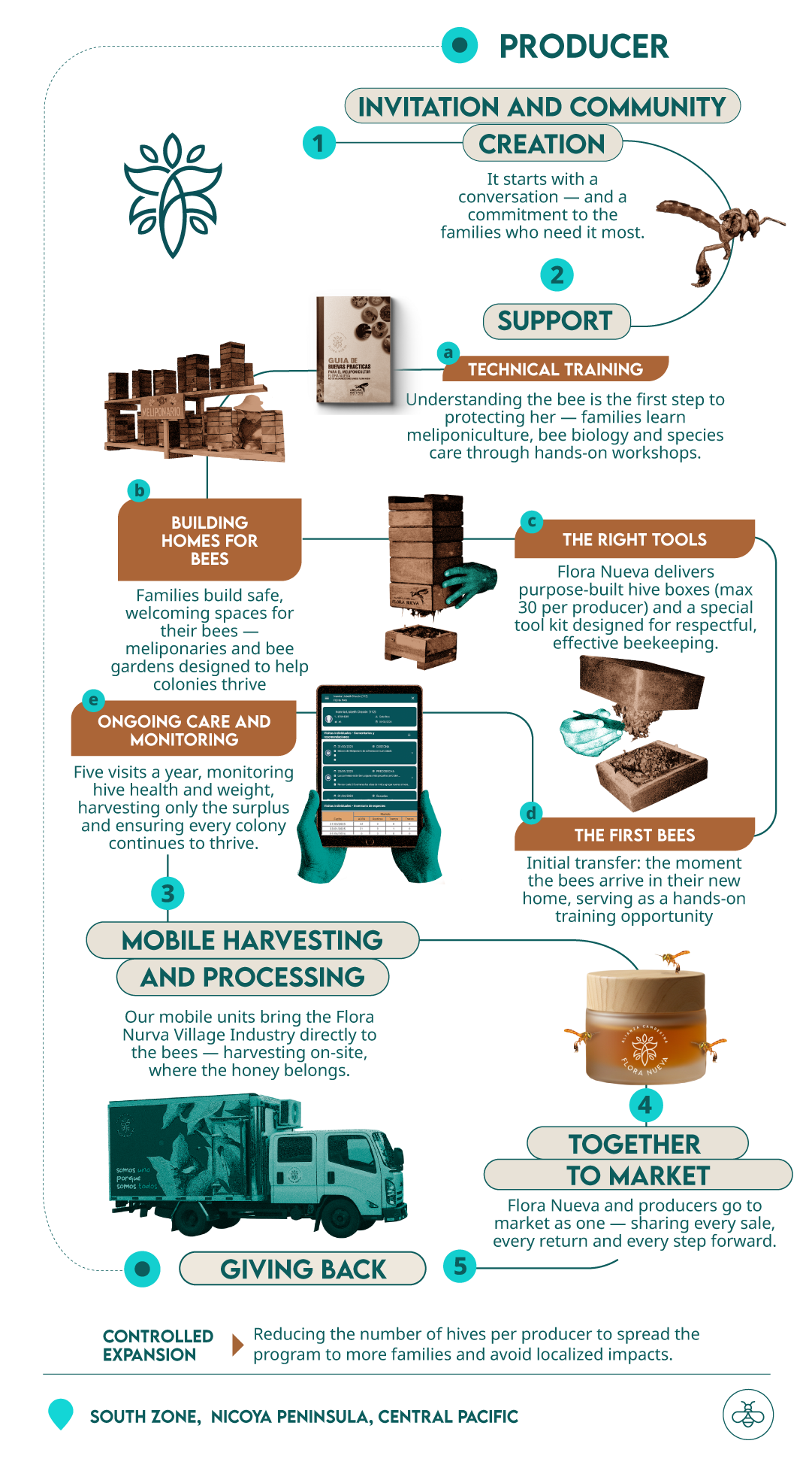 The Native Bees Program is the beating heart of Flora Nueva — its reach and territorial impact are unmatched. It is proof that economic growth, environmental protection and social well-being can thrive together in a single living model of regeneration.