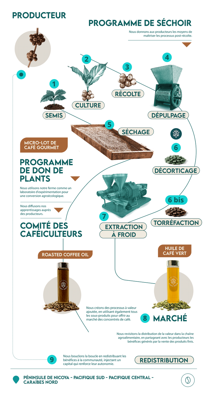 Conçu comme un laboratoire de solutions, ce programme dépasse largement la simple commercialisation du café vert. Si notre parcours a débuté avec l’huile de café, nous avons élargi notre action pour couvrir l’ensemble de la chaîne de valeur, en abordant les enjeux à leur racine.