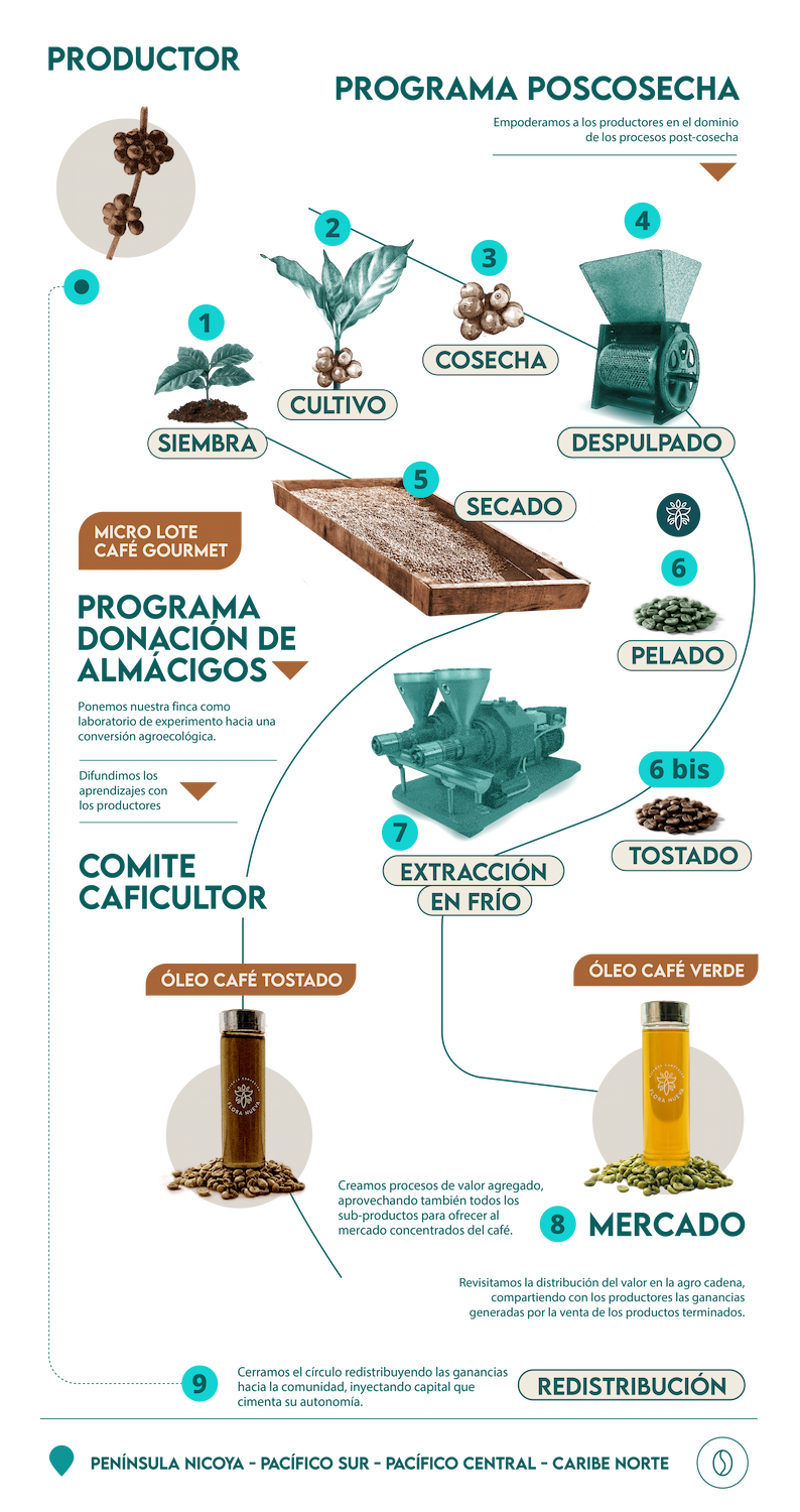 Concebido como un laboratorio de soluciones, este programa no se limita a la comercialización del grano. Aunque iniciamos nuestro camino a través del aceite de café, hemos expandido nuestra acción para cubrir la integralidad de la cadena, abordando todas las problemáticas desde la raíz.